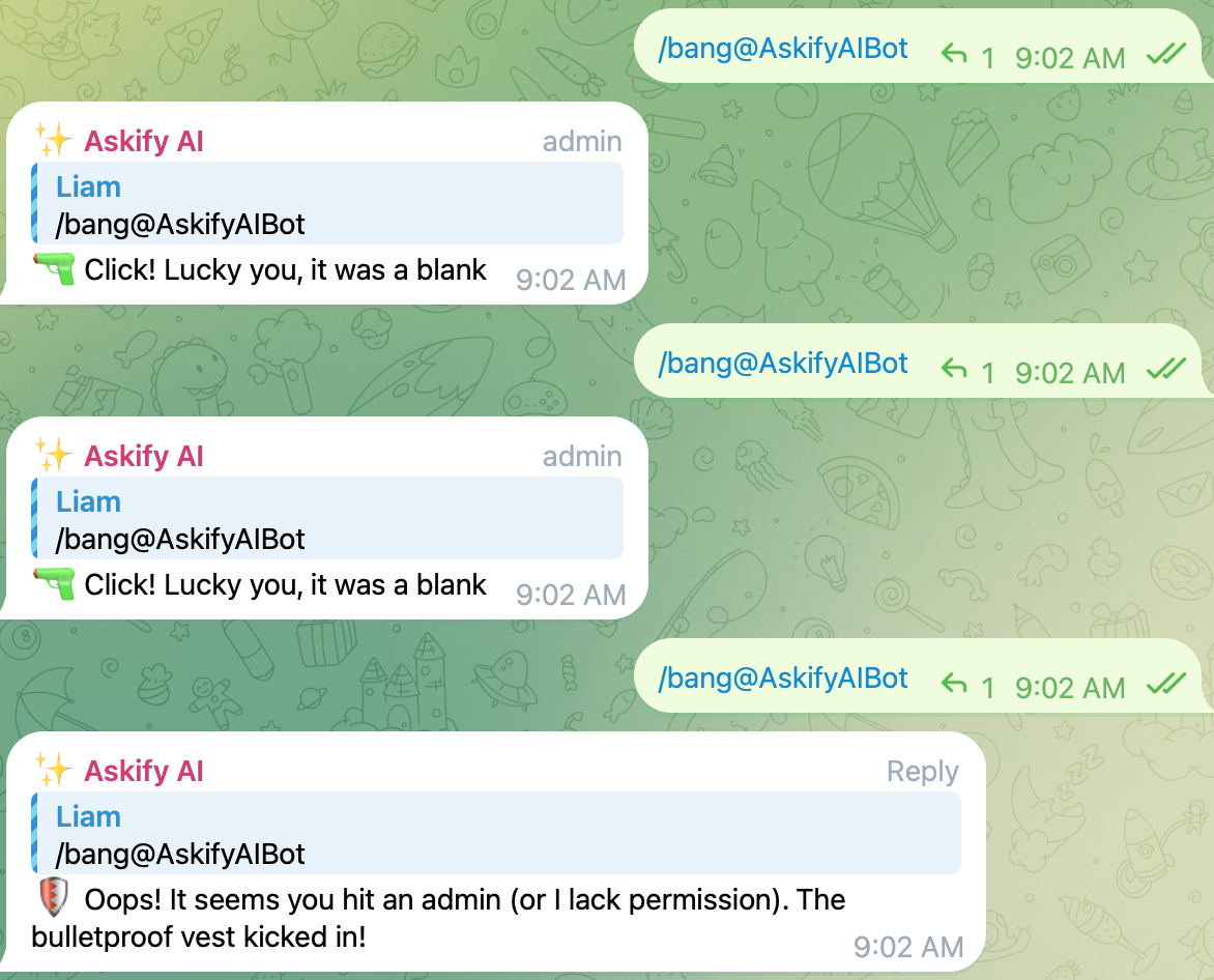 This command can only be used in group chats. In a group, each person can trigger the /bang command. Each round has 6 chances, and getting shot results in a 3-minute mute