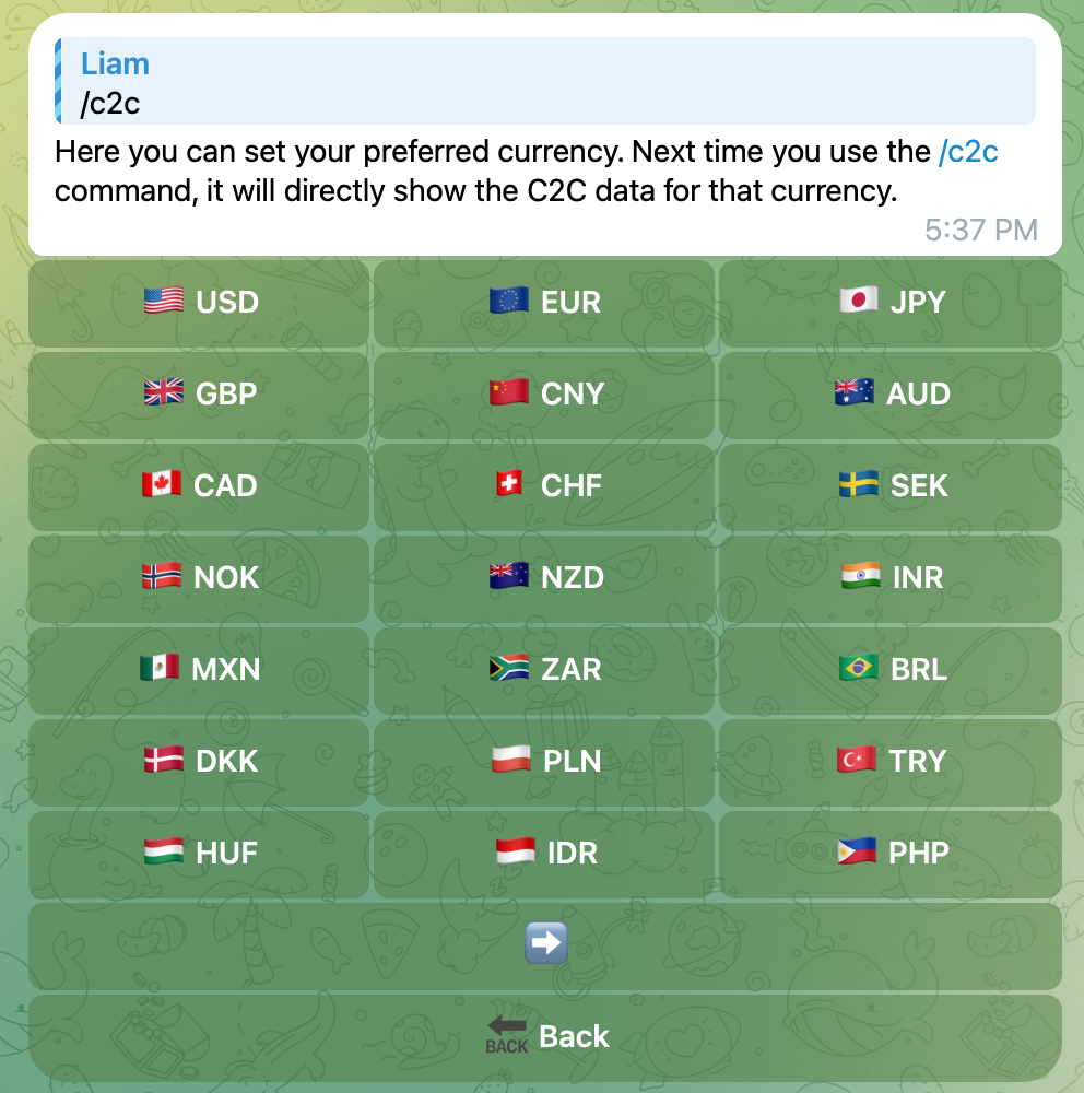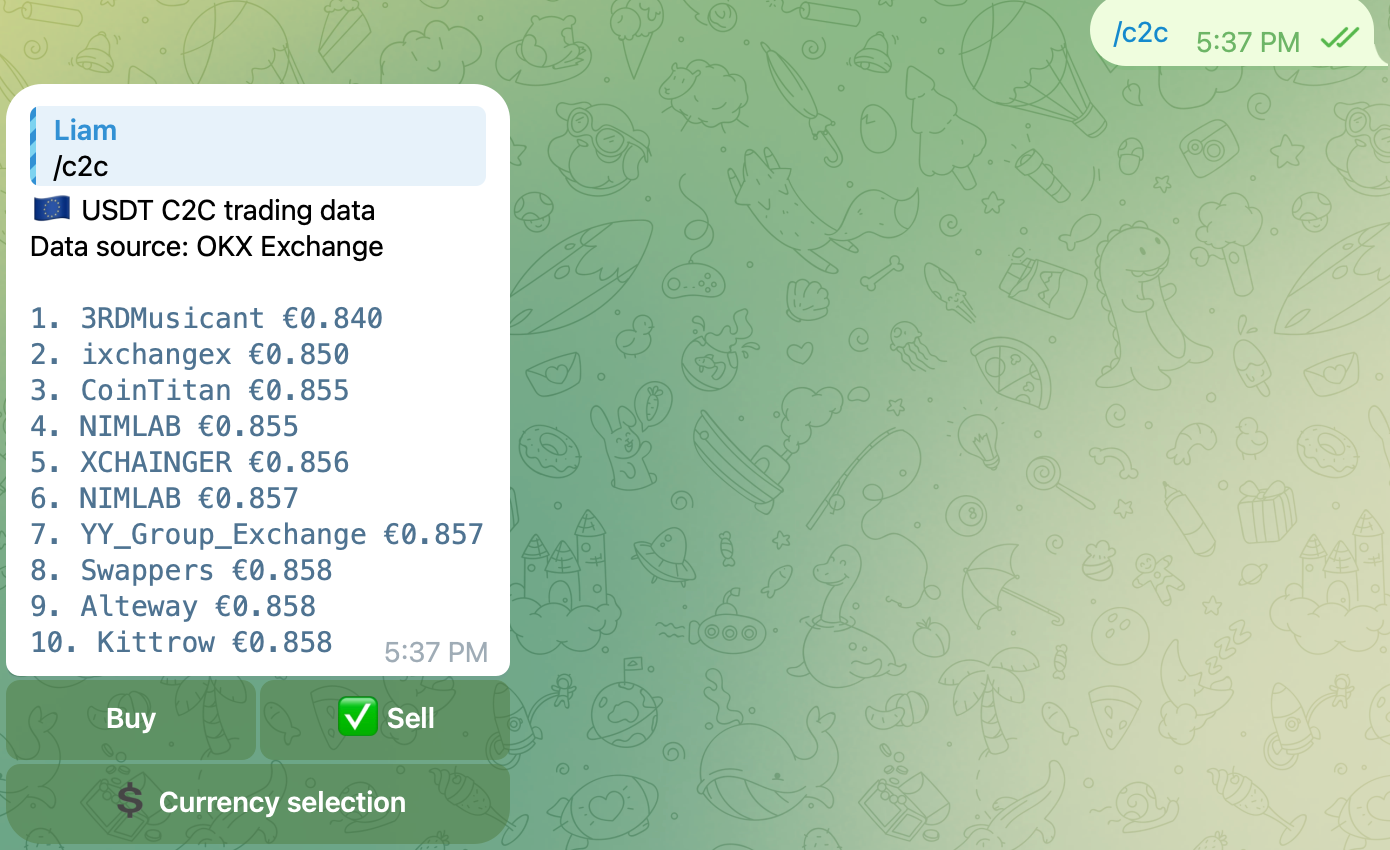 In a private chat, just send c2c to get real-time USDT C2C trading data instantly.