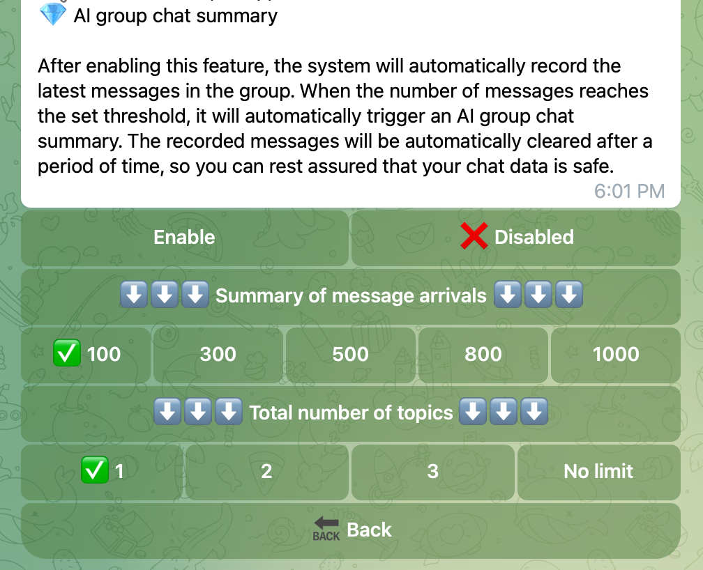 After enabling this feature, the system will automatically record the latest messages in the group. When the number of messages reaches the set threshold, it will automatically trigger an AI group chat summary. The recorded messages will be automatically cleared after a period of time, so you can rest assured that your chat data is safe.