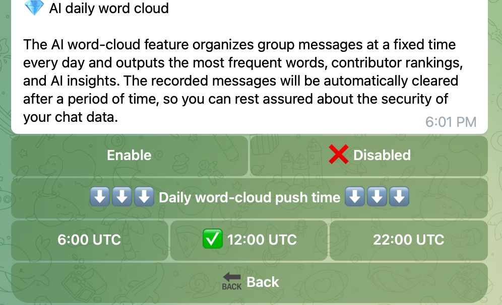 The AI word-cloud feature organizes group messages at a fixed time every day and outputs the most frequent words, contributor rankings, and AI insights. The recorded messages will be automatically cleared after a period of time, so you can rest assured about the security of your chat data.