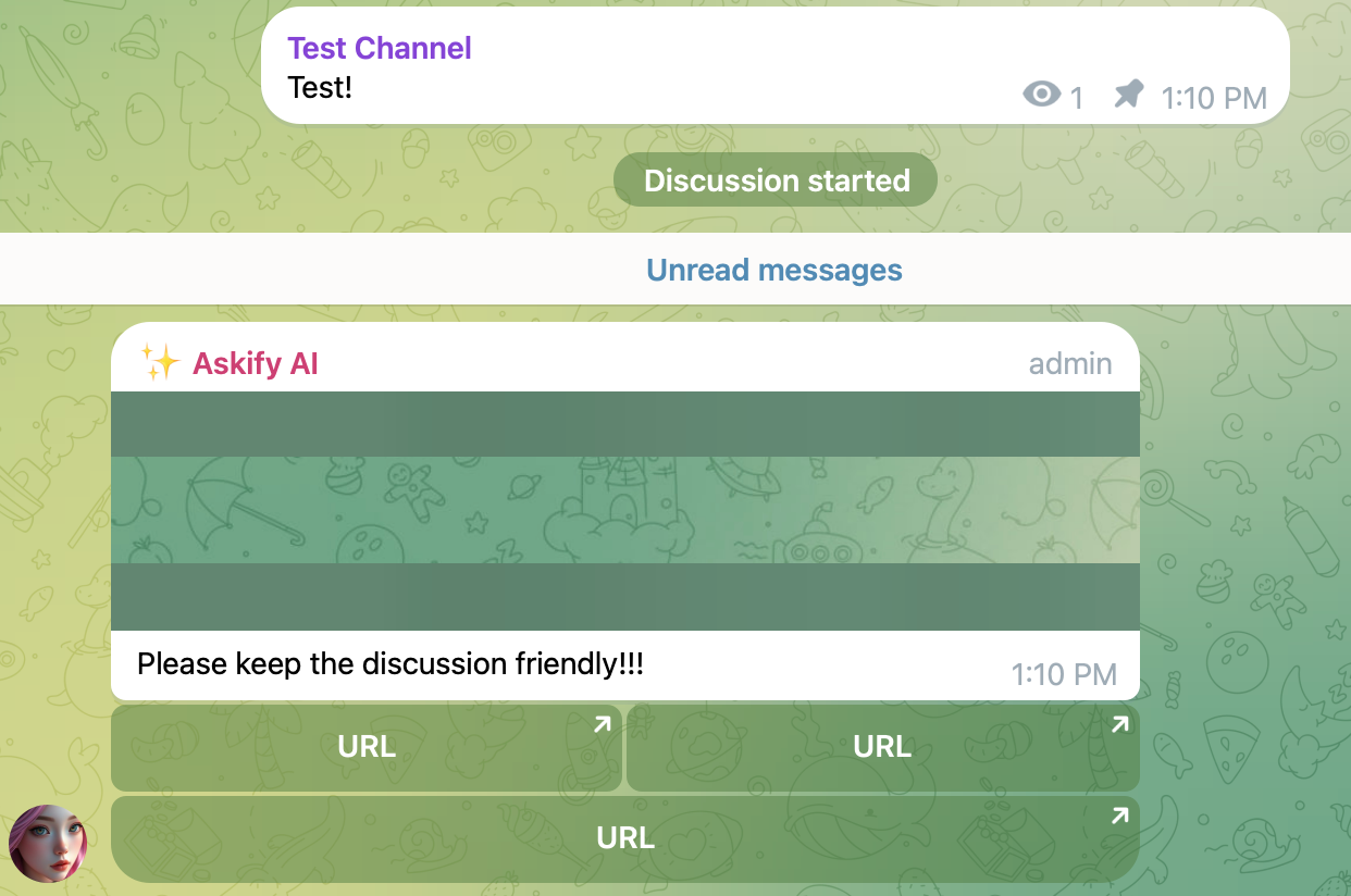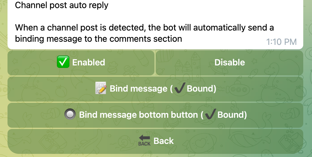 When a channel post is detected, the bot will automatically send a binding message to the comments section.