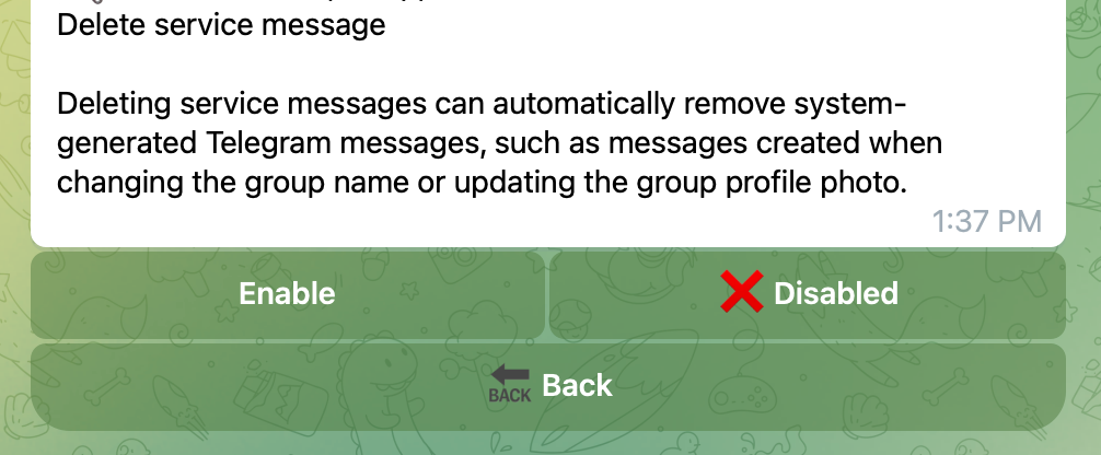 Deleting service messages can automatically remove system-generated Telegram messages, such as messages created when changing the group name or updating the group profile photo.