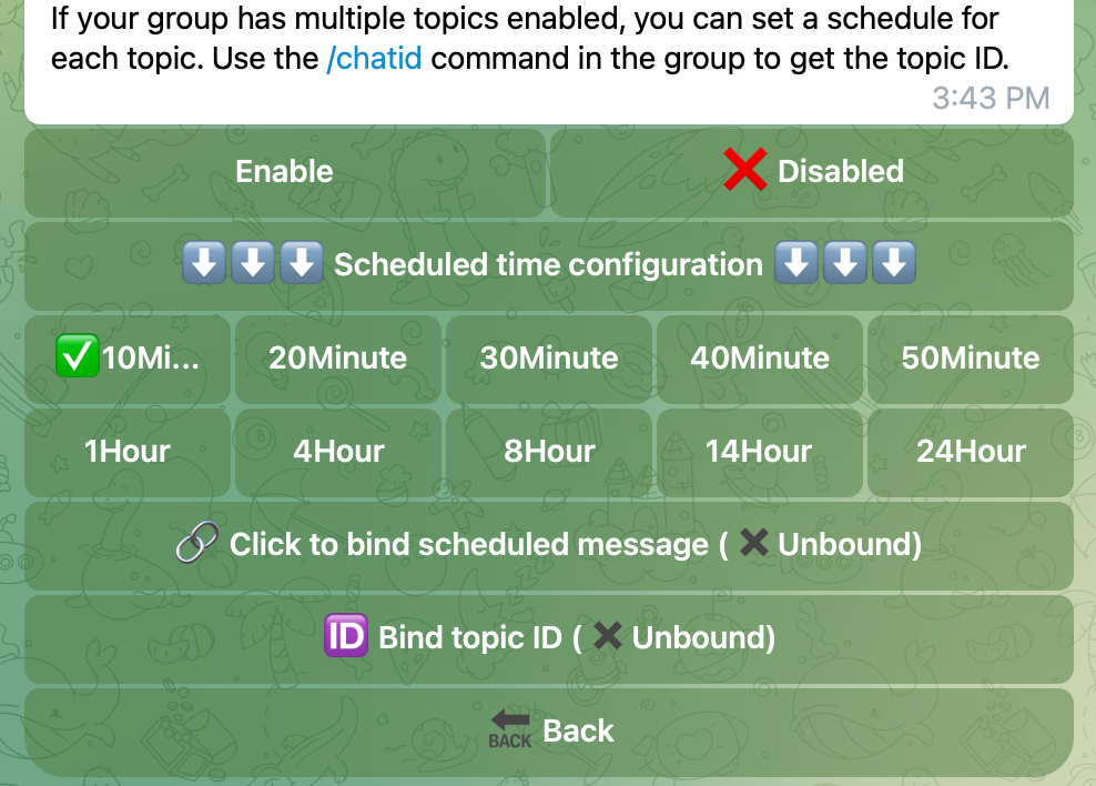 The scheduled message sending feature can help your channel or group send messages at scheduled intervals. For example, if you want to send a message to the group or channel every hour, you can use this feature. It’s recommended to set a longer interval to avoid disturbing users in the group.