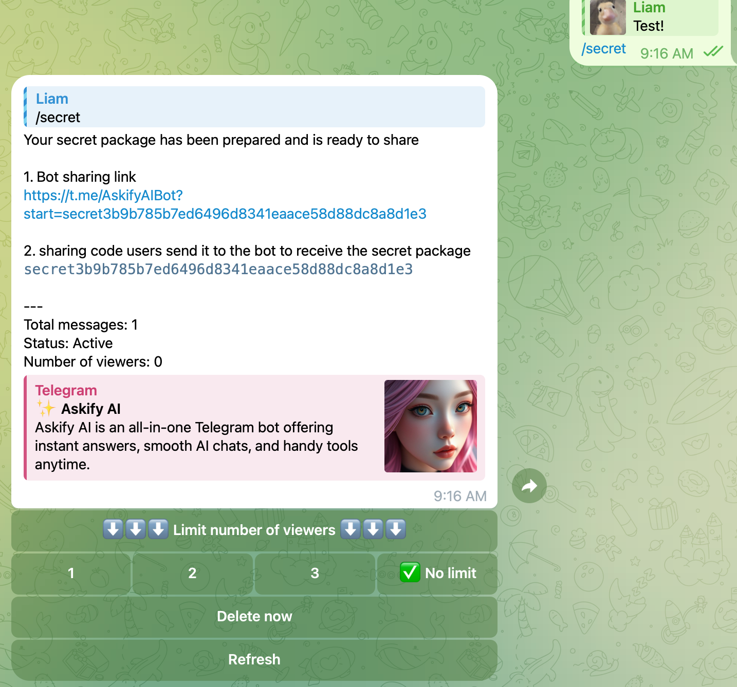 t.me/AskifyAIBot?start=secret...(Users click this to go straight to the reveal). - A Sharing Code: A unique string (e.g.,
