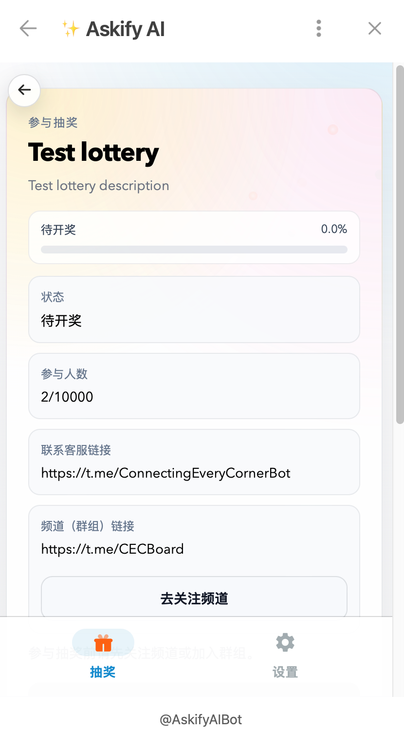 Askify AI Bot 在 Telegram Mini App 中提供了抽奖功能,你可以通过下面地址打开:
