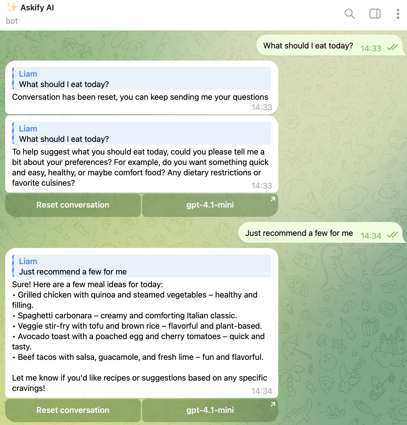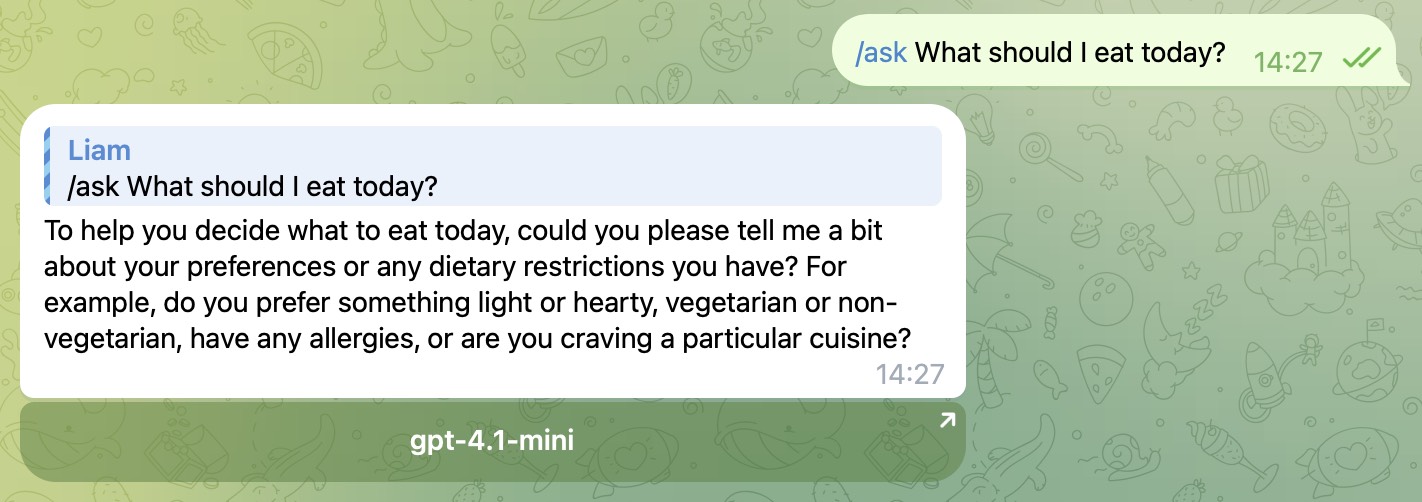 这将使用默认的AI模型来回答你的问题, 如果你想直接指定某个模型, 可以这样: /ask llama 今天吃什么好?