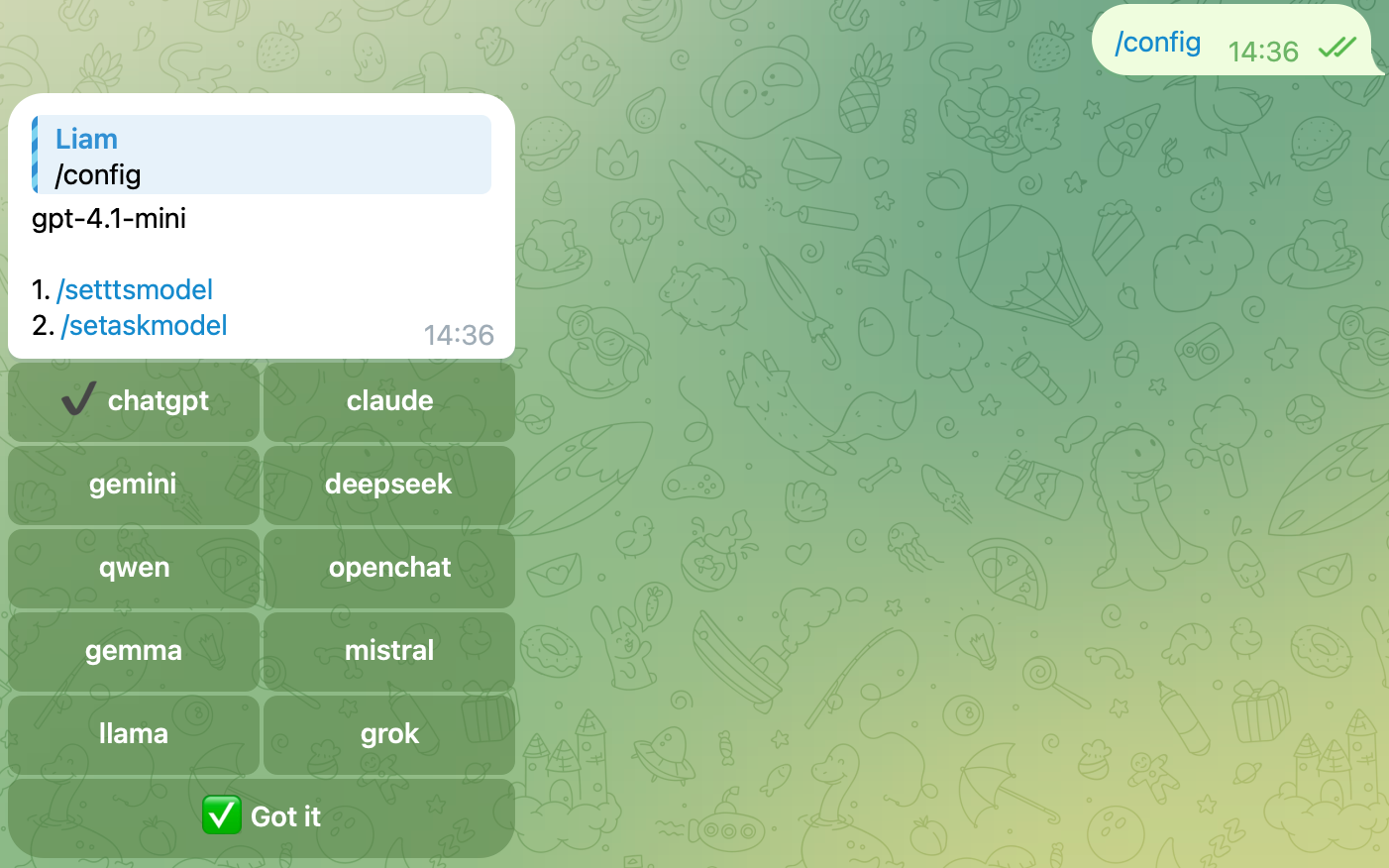 这个机器人提供多种模型供你定制和选择, 如果你想在 /chat 命令中使用特定模型, 可以使用此命令进行设置