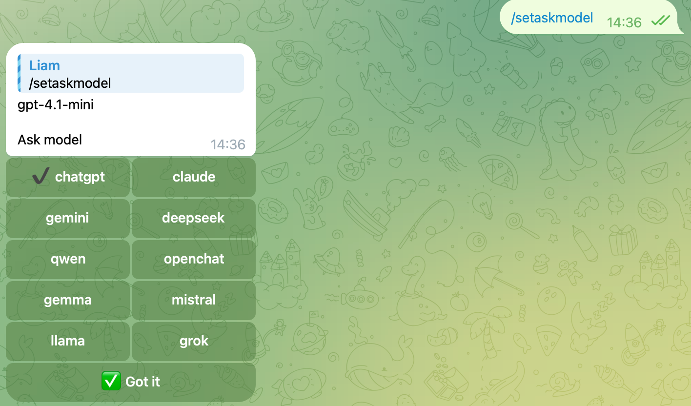 这个机器人提供多种模型供你定制和选择, 如果你想在 /ask 命令中使用特定模型, 可以使用此命令进行设置