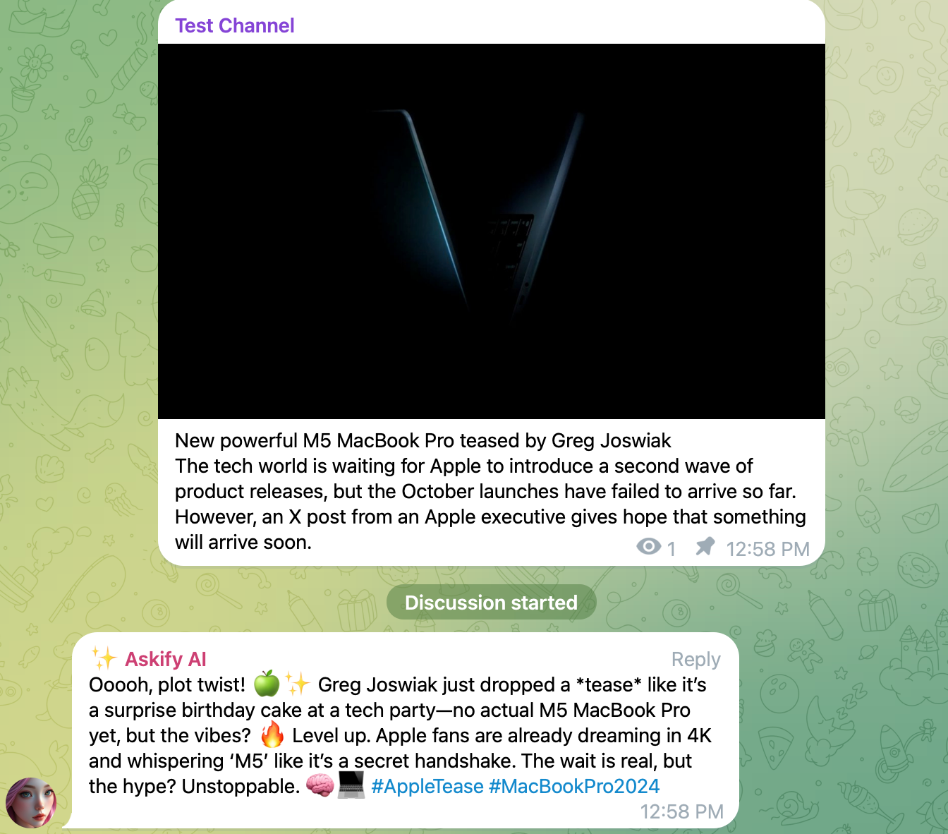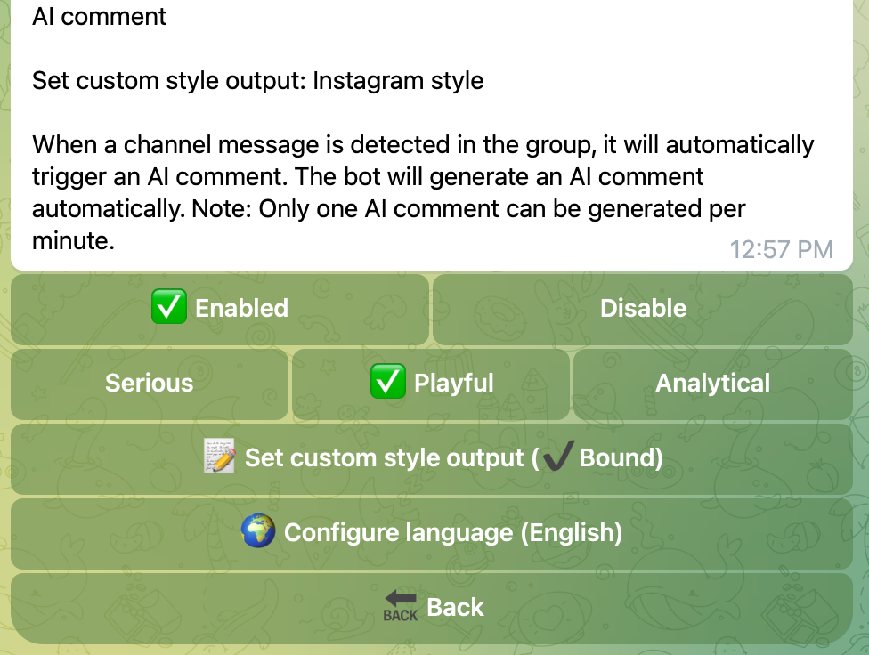 群内检测到频道消息会自动触发AI评论, 机器人会自动生成AI评论。 注意: 每一分钟内仅能生成一条AI评论